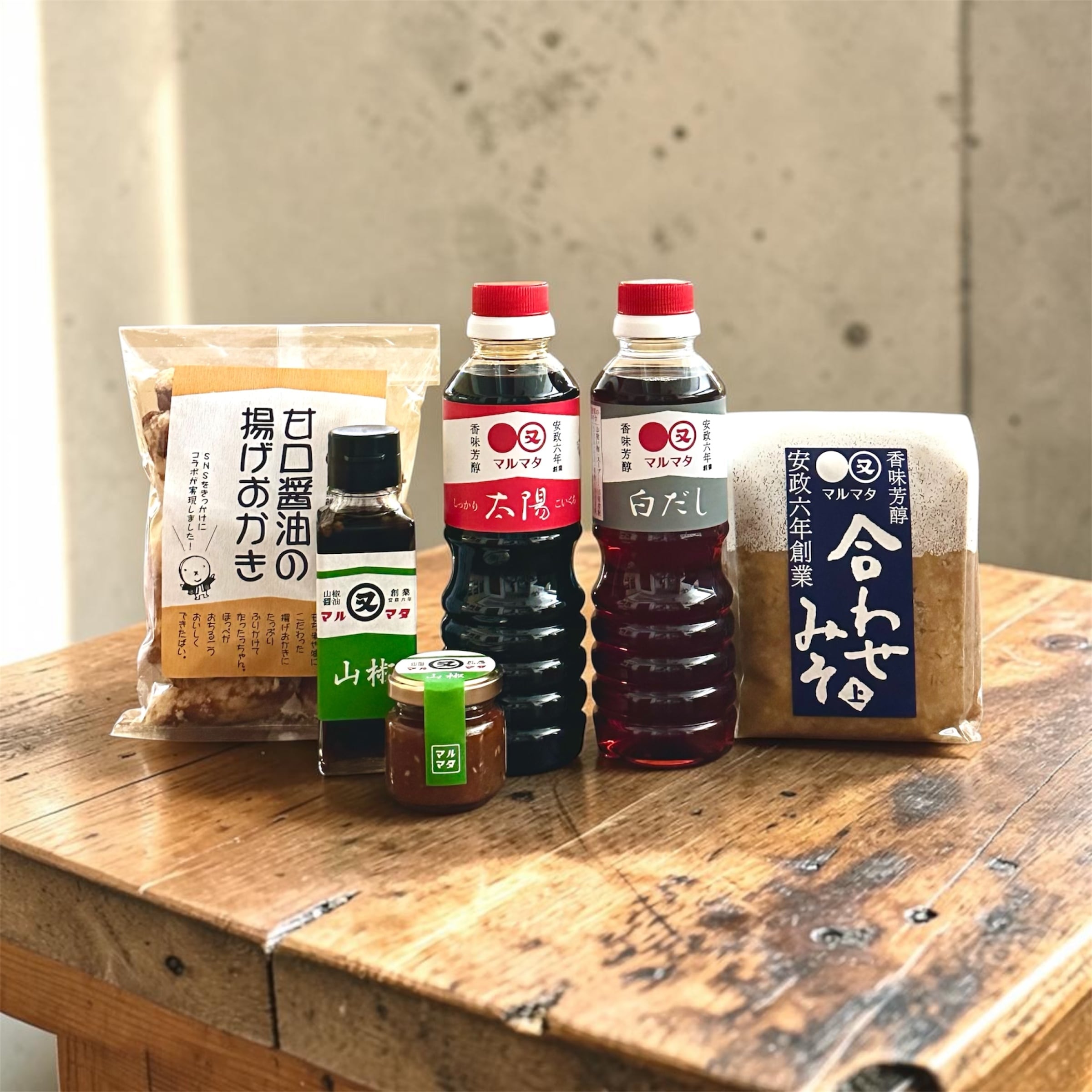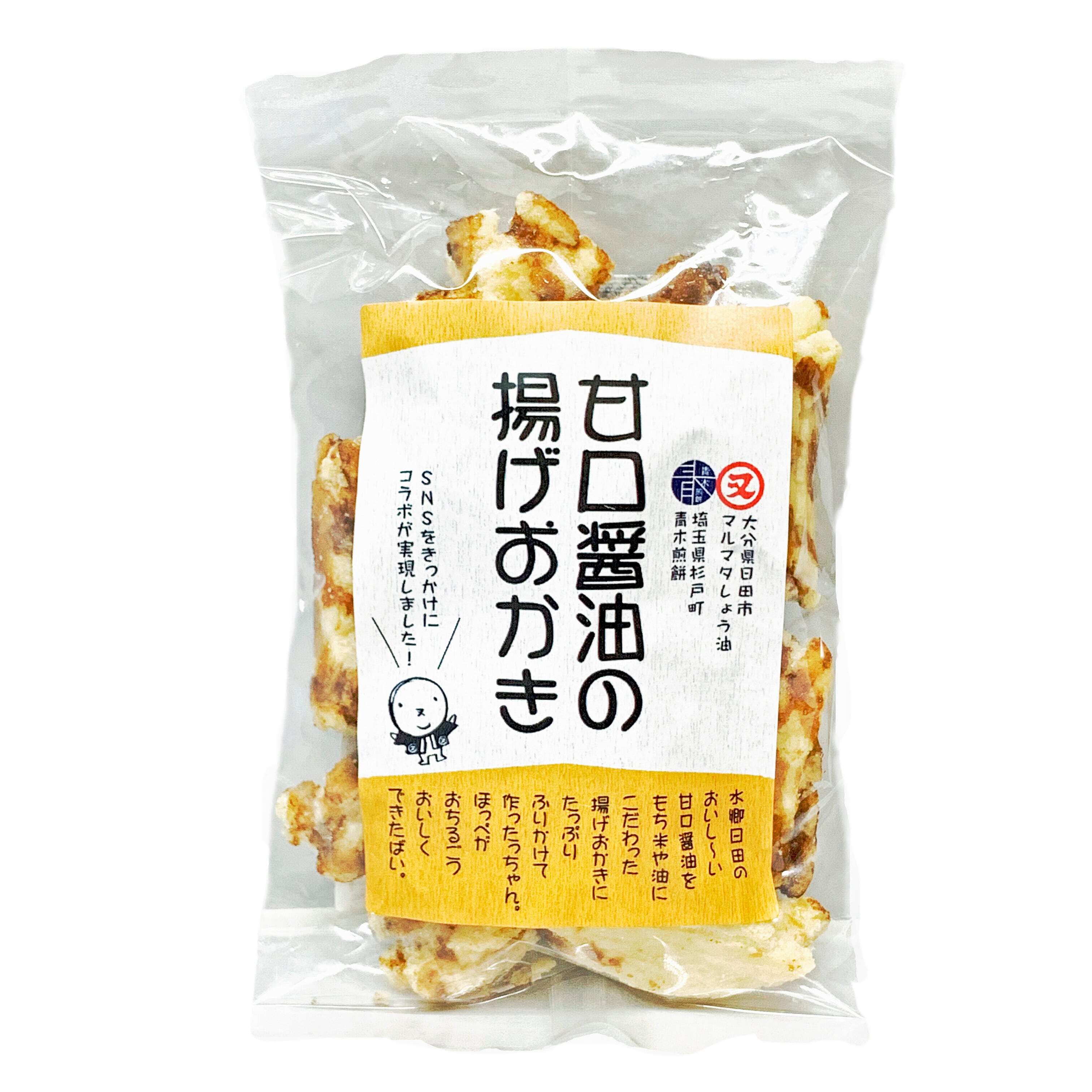 マルマタの甘口さしみ醤油を、お米・油にこだわった揚げおかきにたっぷりふりかけて作りました。